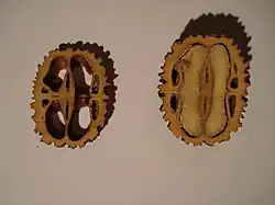 Les fruits sont des drupes contenant des noix de 4 à 5 cm de diamètre de forme subglobuleuse, à coque rugueuse très dure.
