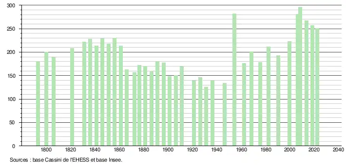 L'évolution du nombre d'habitants est connue à travers les recensements de la population effectués dans la commune depuis 1793. Pour les communes de moins de 10 000 habitants, une enquête de recensement portant sur toute la population est réalisée tous les cinq ans, les populations de référence des années intermédiaires étant quant à elles estimées par interpolation ou extrapolation[17]. Pour la commune, le premier recensement exhaustif entrant dans le cadre du nouveau dispositif a été réalisé en 2008[18].