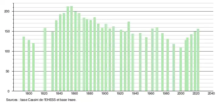 L'évolution du nombre d'habitants est connue à travers les recensements de la population effectués dans la commune depuis 1793. Pour les communes de moins de 10 000 habitants, une enquête de recensement portant sur toute la population est réalisée tous les cinq ans, les populations de référence des années intermédiaires étant quant à elles estimées par interpolation ou extrapolation[20]. Pour la commune, le premier recensement exhaustif entrant dans le cadre du nouveau dispositif a été réalisé en 2008[21].
