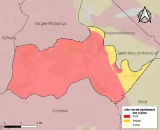 La commune est vulnérable au risque de mouvements de terrains constitué principalement du retrait-gonflement des sols argileux[15]. Cet aléa est susceptible d'engendrer des dommages importants aux bâtiments en cas d’alternance de périodes de sécheresse et de pluie. La totalité de la commune est en aléa moyen ou fort (90 % au niveau départemental et 48,5 % au niveau national). Sur les 121 bâtiments dénombrés sur la commune en 2019, 121 sont en aléa moyen ou fort, soit 100 %, à comparer aux 83 % au niveau départemental et 54 % au niveau national. Une cartographie de l'exposition du territoire national au retrait gonflement des sols argileux est disponible sur le site du BRGM[16],[Carte 2].