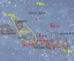 À une distance d'environ 130 pc (∼424 al) du système solaire se situe la nébuleuse de la Pipe, un jeune nuage moléculaire qui se trouve dans la même région que le nuage de Rho Ophiuchi, à quelques dizaines de parsecs de lui ; dans ce nuage les phénomènes de formation d'étoiles sont très limités et confinés à la région de B 59, la section du nuage la plus proche de ρ Ophiuchi[31]. À la même distance, mais à une latitude galactique différente, se trouve également le nuage de la Couronne australe, un petit complexe nébuleux dans lequel la formation d'étoiles de petite, moyenne et grande masses est active, jusqu'aux étoiles de classe B (étoiles bleu-blanc de la séquence principale et d'Herbig Be). Les très jeunes variables R CrA et T CrA sont associées à cette région. En raison de sa position différente sur le plan galactique, ce nuage ne fait pas partie, contrairement aux précédents, ni à la ceinture de Gould, ni à l'anneau de Lindblad, mais il s'inscrit dans le cadre de la bulle de la Boucle I[32].