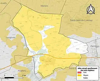 Le retrait-gonflement des sols argileux est susceptible d'engendrer des dommages importants aux bâtiments en cas d’alternance de périodes de sécheresse et de pluie. 79,9 % de la superficie communale est en aléa moyen ou fort (54,2 % au niveau départemental et 48,5 % au niveau national). Sur les 479 bâtiments dénombrés sur la commune en 2019, 461 sont en aléa moyen ou fort, soit 96 %, à comparer aux 57 % au niveau départemental et 54 % au niveau national. Une cartographie de l'exposition du territoire national au retrait gonflement des sols argileux est disponible sur le site du BRGM[11],[Carte 2].