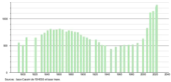 L'évolution du nombre d'habitants est connue à travers les recensements de la population effectués dans la commune depuis 1793. Pour les communes de moins de 10 000 habitants, une enquête de recensement portant sur toute la population est réalisée tous les cinq ans, les populations de référence des années intermédiaires étant quant à elles estimées par interpolation ou extrapolation[16]. Pour la commune, le premier recensement exhaustif entrant dans le cadre du nouveau dispositif a été réalisé en 2006[17].