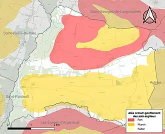 Le retrait-gonflement des sols argileux est susceptible d'engendrer des dommages importants aux bâtiments en cas d’alternance de périodes de sécheresse et de pluie. 72,8 % de la superficie communale est en aléa moyen ou fort (54,2 % au niveau départemental et 48,5 % au niveau national). Sur les 127 bâtiments dénombrés sur la commune en 2019, 101 sont en aléa moyen ou fort, soit 80 %, à comparer aux 57 % au niveau départemental et 54 % au niveau national. Une cartographie de l'exposition du territoire national au retrait gonflement des sols argileux est disponible sur le site du BRGM[13],[Carte 2].