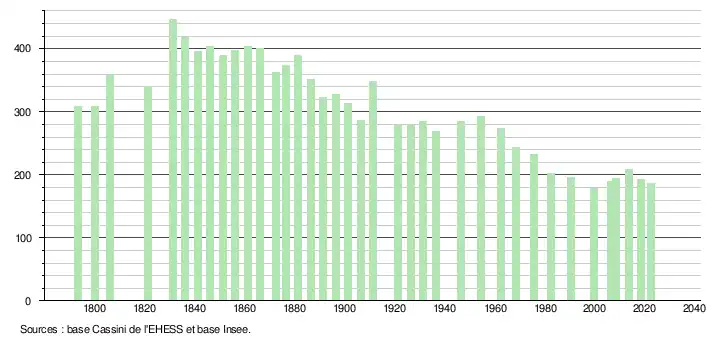 L'évolution du nombre d'habitants est connue à travers les recensements de la population effectués dans la commune depuis 1793. Pour les communes de moins de 10 000 habitants, une enquête de recensement portant sur toute la population est réalisée tous les cinq ans, les populations de référence des années intermédiaires étant quant à elles estimées par interpolation ou extrapolation[17]. Pour la commune, le premier recensement exhaustif entrant dans le cadre du nouveau dispositif a été réalisé en 2008[18].