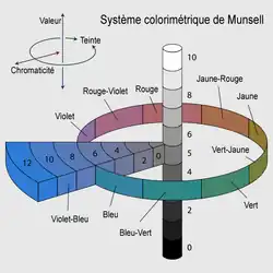 - ↑ G. de Bernard, « La sensation des couleurs », Le Dessin, Paris, , p. 250-255 (lire en ligne)Conférence de Munsell à l'Association des professeurs de dessin le 14 mai 1914. « Qualités » p. 251.