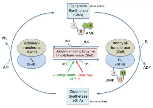 De nombreuses enzymes métaboliques sont modifiées par des nucléotidyltransférases. La fixation d'une AMP (adénylylation) ou d'une UMP (uridylylation) peut activer ou inactiver une enzyme ou modifier sa spécificité (voir figure). Ces modifications peuvent conduire à des réseaux de régulation complexes qui peuvent ajuster finement les activités enzymatiques afin que seuls les composés nécessaires soient fabriqués (ici : la glutamine)[1].