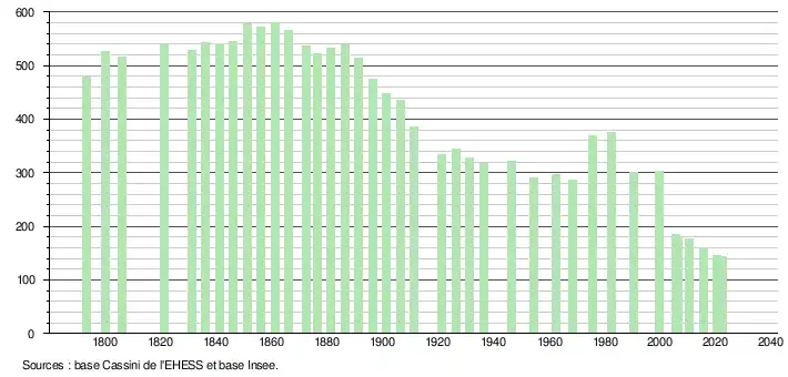 L'évolution du nombre d'habitants est connue à travers les recensements de la population effectués dans la commune depuis 1793. Pour les communes de moins de 10 000 habitants, une enquête de recensement portant sur toute la population est réalisée tous les cinq ans, les populations de référence des années intermédiaires étant quant à elles estimées par interpolation ou extrapolation[15]. Pour la commune, le premier recensement exhaustif entrant dans le cadre du nouveau dispositif a été réalisé en 2005[16].