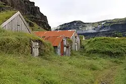 Autour de l'habitation principale (un bâtiment de pierre, construit sur deux niveaux), une chapelle et dix-huit dépendances plus ou moins délabrées confèrent au lieu un charme magique : toutes sont en bois et à toiture de gazon, témoignage de l'habitat des siècles passés. Cette technique de construction est connue en Europe du Nord dès l'âge de fer : elle consiste à couvrir l'édifice d'une épaisse couche de tourbe ou de terre enherbée, très efficace contre les rigueurs du climat. Vers la fin du XVIIIe siècle, une variante s'est développée en Islande avec façades et charpente en bois, tandis que toiture et côtés latéraux sont recouverts de terre[1].