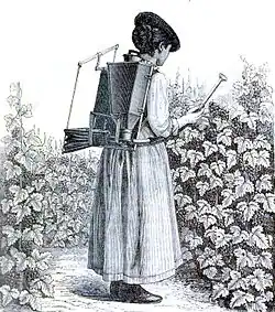 Soufreuse (1888) : un récipient porté à dos contenant du soufre sublimé, muni d'un soufflet ventilateur et d'une lance