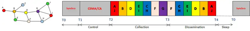 - Une synchronisation distribuée du cycle de fonctionnement basée sur la synchronisation multi-sauts déterministe des nœuds à l'aide de balise envoyée en cascade. Il permet de déterminer la période de sommeil de l'ensemble des nœuds du réseau pour les économies d'énergie.