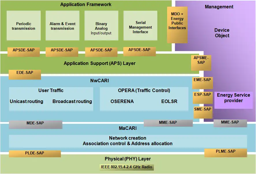 - Coordinateur (équivalent du « PAN coordinator » d'IEEE 802.15.4) : coordinateur global d’un cluster/îlot de capteurs, son rôle est d’initier le réseau et de gérer celui-ci : attribution des adresses réseau, gestion des accès au réseau, point d’accès aux capteurs transparent à la topologie du réseau.