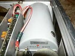 Le cristal de quartz est un matériau piézoélectrique largement utilisé comme résonateur dans les oscillateurs électroniques pour générer des signaux de fréquence[2]. Un OCXO est un type d'oscillateur à quartz parmi d'autres : VCXO, TCXO, MCXO, etc. Il se compose d'un oscillateur classique (résonateur et un circuit électronique oscillant) placé dans une enceinte isolée thermiquement avec un radiateur (souvent un transistor de puissance) et son circuit de régulation[3].