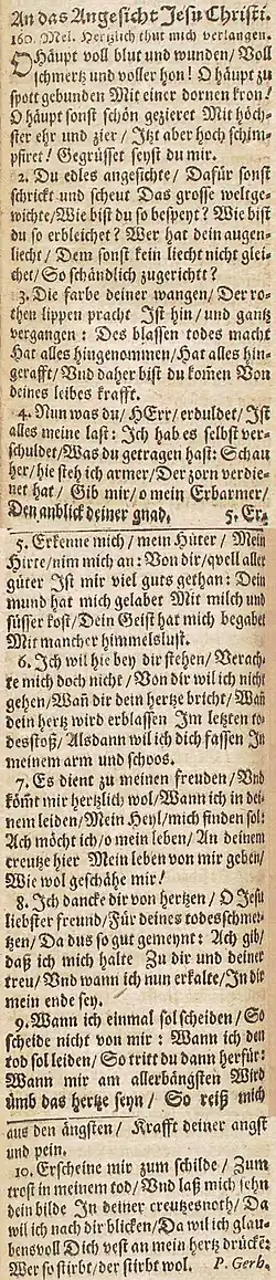 1[2]. O Haupt voll Blut und Wunden, voll Schmerz und voller Hohn, o Haupt, zum Spott gebunden mit einer Dornenkron, o Haupt, sonst schön gezieret[3] mit höchster Ehr und Zier, jetzt aber hoch schimpfieret[4]: gegrüßet seist du mir!