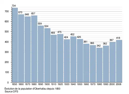 Selon l'Office fédéral de la statistique, Oberhallau compte 418 habitants en 2008[1]. Sa densité de population atteint 69 hab./km2.