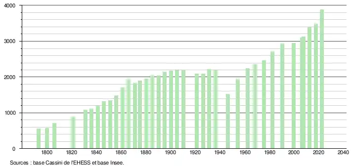 L'évolution du nombre d'habitants est connue à travers les recensements de la population effectués dans la commune depuis 1793. Pour les communes de moins de 10 000 habitants, une enquête de recensement portant sur toute la population est réalisée tous les cinq ans, les populations de référence des années intermédiaires étant quant à elles estimées par interpolation ou extrapolation[21]. Pour la commune, le premier recensement exhaustif entrant dans le cadre du nouveau dispositif a été réalisé en 2007[22].