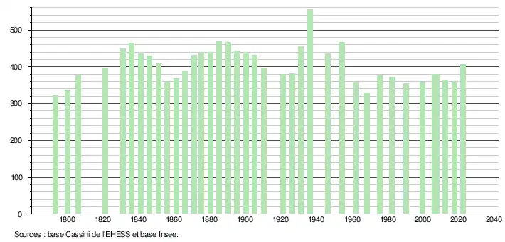 L'évolution du nombre d'habitants est connue à travers les recensements de la population effectués dans la commune depuis 1793. Pour les communes de moins de 10 000 habitants, une enquête de recensement portant sur toute la population est réalisée tous les cinq ans, les populations de référence des années intermédiaires étant quant à elles estimées par interpolation ou extrapolation[20]. Pour la commune, le premier recensement exhaustif entrant dans le cadre du nouveau dispositif a été réalisé en 2007[21].