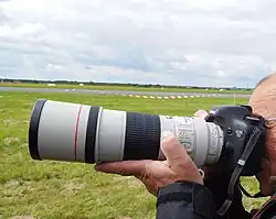 - À partir de 600 mm les objectifs disponibles sont, à l'exception de quelques modèles catadioptriques, lourds et coûteux et nécessitent d'utiliser souvent un pied photographique. Pour la photographie terrestre, le record de focale pour le format 24 × 36 semble être le 1 200 mm de Pentax (1986-2000 ; 8,58 kg) et celui de Canon, pesant 16,5 kg, coûtant autour de 100 000 €, et nécessitant un délai de dix-huit mois pour être fabriqué à l'unité (Il en existerait entre 12 et 20 exemplaires dans le monde)[2],[3] ; sans oublier le zoom Nikkor 1200-1700, pesant lui aussi 16 kg et mesurant presque 90 cm de long. Mais une focale de 2 000 mm est nécessaire pour une photo de la lune couvrant presque le petit bord de la photo, et des focales encore supérieures pourraient être utiles en photo astronomique.