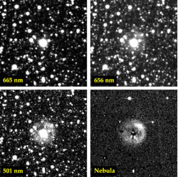 - ↑ (en) O. Chesneau et G. Clayton, « A dense disk of dust around the born-again Sakurai's object », Astronomy & Astrophysics, vol. 493, no 2, , L17–L20 (DOI 10.1051/0004-6361:200811173, Bibcode 2009A&A...493L..17C, arXiv 0811.3295).