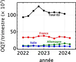 La France prononce beaucoup plus de mesures d'éloignement que ses voisins[60],[76] : 31 195 au deuxième trimestre 2024, contre 12 885 en Allemagne ou 6 380 en Italie[77]. Elle a doublé le nombre d'OQTF prononcées entre 2015 et 2024, sans arriver à faire varier le nombre de celles qui sont exécutées[5],[60],[66].