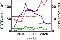 Le taux d'exécution des mesures d'OQTF s'établissait à environ 15 % en 2018, démontrant que les mesures d'éloignement prises n'étaient que très rarement exécutées[56]. Le taux d'exécution de ces mesures d'éloignement a diminué ces dernières années (13,5 % en 2017, 12 % en 2019, puis, avec la crise du Covid-19, seulement 6,9 % en 2020 et 5,6 % au premier semestre 2021)[57],[58] avant de retrouver une hausse de 30 % en 2023[59]. Le taux d'exécution des mesures d'éloignement est de 30 % au niveau européen[60].