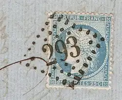 - ↑ E.H. de Beaufond Catalogue des oblitérations des timbres de France 1876-1900 émission au type Sage Paris 1960