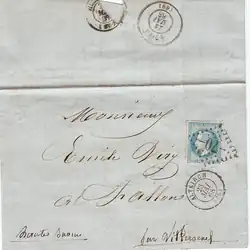 À partir de 1852, l'administration met en service des cachets oblitérants ou chaque bureau de poste est repéré par un code numérique constitué de petits chiffres. Sur lettre, ce cachet est toujours accompagné d'un cachet dateur qui est supposé faire apparaitre la date d'envoi de façon lisible.