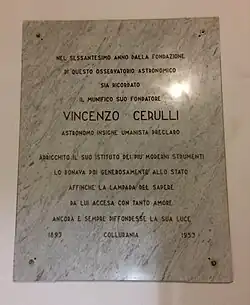 Il a été fondé par l'astronome Vincenzo Cerulli, auquel ensuite il a été dédié : en effet, entre 1890 et 1893, il a fait construire la structure dans la localité de Collurania sur les collines devant Teramo. La construction a donné le nom au village entier sur lequel il est situé. Entouré d'un grand parc de pins, de cyprès et de sapins, l'observatoire avec le dôme blanc caractéristique du pavillon principal, représente l'un des traits les plus caractéristiques du paysage local.