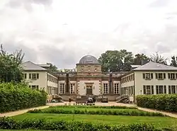 Le nouveau bâtiment de l'observatoire, construit entre 1803 et 1816, se trouvait à l'extérieur des murs de la ville, sur la voie menant à Geismar (aujourd'hui Geismar Landstraße 11). Sa construction, sur un terrain en légère pente ascendante vers le nord, est financée par le roi anglo-hanovrien George III. Son architecte en fut le maître d'œuvre universitaire Georg Heinrich Borheck . Retardé par les guerres napoléoniennes, le bâtiment ne put être achevé qu'en 1816 sous l'autorité du directeur des constructions Justus Heinrich Müller[5],[6].