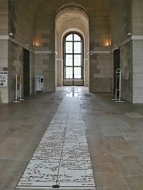 - ↑ Constituée de 32 règles de laiton mises bout à bout, enchâssées dans des dalles de marbre blanc.