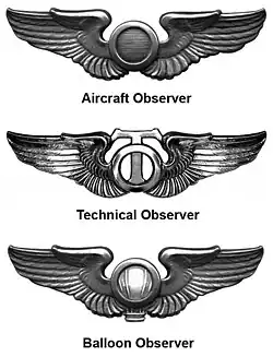 Les observateurs de ballons pouvaient également prétendre à l'insigne, qui était généralement appelé à la fois insigne d'observateur d'avion (Airplane Observer Badge) et insigne d'observateur de ballons (Balloon Observer Badge). Le dessin de l'insigne décerné était identique dans les deux cas et, vers la fin de la Première Guerre mondiale, il était communément appelé "insigne d'observateur d'avions et de ballons" ("Airplane and Balloon Observer Badge"), bien que les grades pour lesquels l'insigne était délivré soient restés distincts.