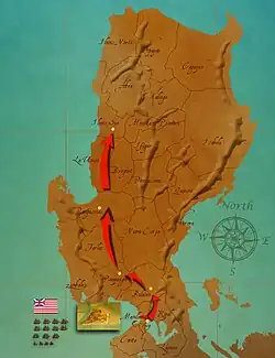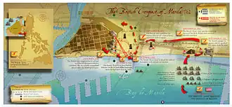 Le , l’expédition britannique en provenance de Madras arriva en baie de Manille. Elle était composée de sept vaisseaux de ligne, trois frégates et quatre navires de soutien, emportant 6 839 hommes (militaires, marins, et hommes de la Royal Marines) sous le commandement de William Draper (en), alors général de brigade, et du contre-amiral Samuel Cornish (en)[2]. La bataille qui s’ensuivit est appelée la bataille de Manille et se termina le par la prise de la ville fortifiée. La victoire fut obtenue grâce à une brèche ouverte dans le rempart de la ville par l’artillerie. Les Britanniques incendièrent alors les quartiers alentour pour forcer les défenseurs à quitter les murailles, et purent ainsi exploiter la brèche le en prenant les fortifications sans grande difficulté. Le port de Cavite, tout proche, fut pris le [10].