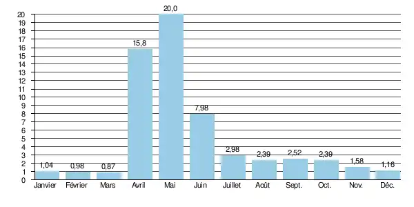 Le débit moyen mensuel observé en mars (minimum d'étiage) est de 0,87 m3/s, soit plus ou moins 4,5 % du débit moyen du mois de mai (20,0 m3/s), ce qui témoigne de l'amplitude assez importante des variations saisonnières. Et ces écarts de débit peuvent être encore plus élevés selon les années : sur la durée d'observation de 20 ans, le débit mensuel minimal a été de 0,43 m3/s en et (430 litres), tandis que le débit mensuel maximal s'élevait à 75,8 m3/s en .