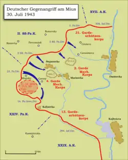 L'offensive Mious voit le déploiement de 271 790 hommes avec 737 chars et canons d'assaut au sein de quatre armées de campagne ainsi que la 8e armée aérienne (en) contre les 11 divisions fortement en sous-effectifs de la 6e armée allemande. Les Soviétiques réalisent une percée de 15 kilomètres de profondeur et de 20 kilomètres de large, alarmant le haut commandement allemand. Après l'intervention initiale d'Adolf Hitler pour retarder le mouvement des renforts allemands, une contre-offensive déployant 258 chars opérationnels dans cinq divisions Panzer et Panzergrenadier, dont les divisions SS Das Reich et Totenkopf, est lancée le 30 juillet. La contre-attaque allemande est soutenue par le 4e corps aérien de la Luftwaffe, fournissant un appui aérien rapproché et une interdiction aérienne contre l'Armée rouge. L'attaque remporte un succès immédiat, encerclant cinq divisions soviétiques le deuxième jour. Une déroute confuse et générale des armées soviétiques vers le Mious s'ensuivit. Le 2 août, les Allemands atteignent le Mious à Dmytrivka, reprenant leurs positions après avoir infligé au moins 61 070 victimes aux Soviétiques, dont 15 303 répertoriés comme tués ou disparus. Les pertes soviétiques réelles s'avéreront bien plus élevées, car la 6e armée fera 17 762 prisonniers, dépassant le nombre total des tués et disparus[4].