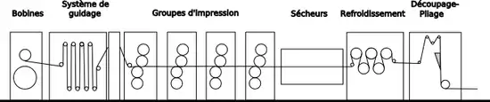 Le dérouleur déroule une bobine de papier en fonction de la vitesse de défilement de la bande. Le débiteur assurera la tension de bande pour permettre d'avoir une tension constante. Les groupes d'impression sont obligatoirement au nombre de quatre pour faire de la quadrichromie et peuvent selon la demande avoir un nombre supérieur. La séquence de la quadrichromie est noir, cyan, magenta et jaune. Elle sera respectée pour permettre d'avoir un meilleur rendu et éviter les refus d'impression. Le sécheur aura pour fonction de sécher l'encre. Il retire les huiles de l'encre pour le séchage. Le papier en sortie de four sera entre 90 °C et 100 °C. Le refroidisseur va refroidir le papier. La superstructure va préparer le papier pour le pliage. La plieuse effectuera deux opérations, tirer le papier pour l'ensemble de la machine et effectuer le pliage en ligne de la bande de papier. Elle coupe le papier et effectue quatre plis possibles : les plis cylindre, double parallèle, delta et équerre.
