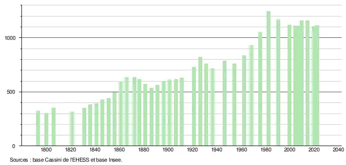 L'évolution du nombre d'habitants est connue à travers les recensements de la population effectués dans la commune depuis 1793. Pour les communes de moins de 10 000 habitants, une enquête de recensement portant sur toute la population est réalisée tous les cinq ans, les populations de référence des années intermédiaires étant quant à elles estimées par interpolation ou extrapolation[31]. Pour la commune, le premier recensement exhaustif entrant dans le cadre du nouveau dispositif a été réalisé en 2004[32].
