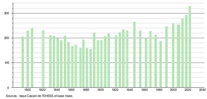 L'évolution du nombre d'habitants est connue à travers les recensements de la population effectués dans la commune depuis 1793. Pour les communes de moins de 10 000 habitants, une enquête de recensement portant sur toute la population est réalisée tous les cinq ans, les populations de référence des années intermédiaires étant quant à elles estimées par interpolation ou extrapolation[16]. Pour la commune, le premier recensement exhaustif entrant dans le cadre du nouveau dispositif a été réalisé en 2007[17].