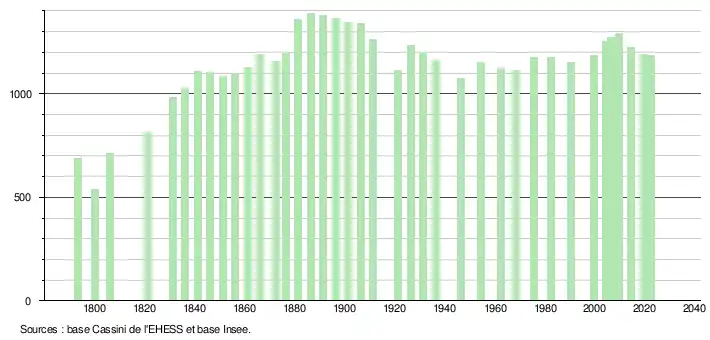 L'évolution du nombre d'habitants est connue à travers les recensements de la population effectués dans la commune depuis 1793. Pour les communes de moins de 10 000 habitants, une enquête de recensement portant sur toute la population est réalisée tous les cinq ans, les populations de référence des années intermédiaires étant quant à elles estimées par interpolation ou extrapolation[31]. Pour la commune, le premier recensement exhaustif entrant dans le cadre du nouveau dispositif a été réalisé en 2004[32].