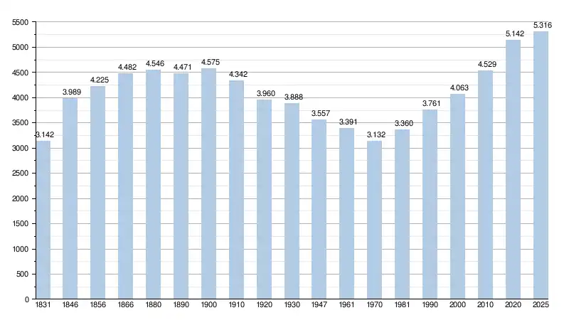 Les chiffres des années 1831 à 1970 tiennent compte des chiffres des anciennes communes fusionnées.