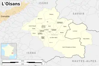 L'Oisans connaît alors une situation autonome relativement comparable à celle des Escartons de Briançonnais[43]. Le territoire est divisé en dix-neuf communautés[44], du fait de sa situation géographique isolée et de sa difficulté d'accès depuis les basses vallées. Oulles a toutefois fait partie un temps du mandement de Séchilienne[3],[45] alors que le Rivier-d'Allemont a fait partie de la seigneurie de Theys[3]. Après la Révolution française, les communes de La Grave et de Villar-d'Arêne réclament leur rattachement aux Hautes-Alpes en espérant bénéficier ainsi du statut avantageux des Escartons, mais leurs privilèges sont rapidement abolis[3].