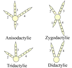 - L'arrangement anisodactyle (trois doigts vers l'avant et un en arrière, aussi appelé hallux) est le plus commun chez les oiseaux et se retrouve tel quel chez leurs ancêtres théropodes, caractérisés par leurs quatre doigts. C'est le cas de la plupart des oiseaux chanteurs, des oiseaux qui doivent se percher et des rapaces.