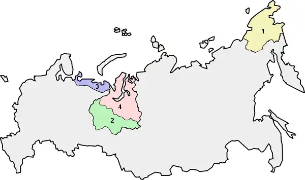 - le district autonome des Evenks et le district autonome du Taïmyr rattachés en 2007 au kraï de Krasnoïarsk ;