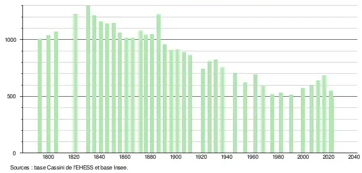 En 2018, la population âgée de 15 à 64 ans s'élève à 399 personnes, parmi lesquelles on compte 69,2% d'actifs (59% ayant un emploi et 10,3% de chômeurs) et 30,8% d'inactifs[Note 6],[I 8]. Depuis 2008, le taux de chômage communal (au sens du recensement) des 15-64 ans est inférieur à celui du département, mais supérieur à celui de la France.