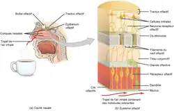 L’olfaction est la fonction sensorielle qui correspond à la perception des substances odorantes. Il s'agit généralement de la perception consciente, qui peut être sollicitée par voie directe (flairage) ou par voie rétro-nasale. Cette fonction est assurée par la muqueuse olfactive qui couvre environ 10 % soit 2 cm2 de la surface totale de la cavité nasale[14]. Des cellules glandulaires, présentes dans la muqueuse et dans la sous-muqueuse, sécrètent un mucus tapissant l'épithélium olfactif, ce qui assure un lavage permanent de la muqueuse.