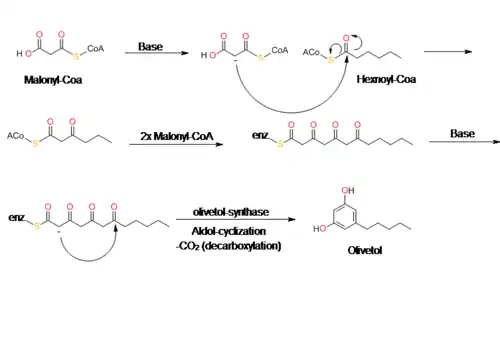 Les données de cette étude concernant la cinétique de l'OLS montrent qu'elle catalyse une aldolisation décarboxylative pour produire l'olivétol. C'est un mécanisme similaire à celui de la stilbène synthase (STS) pour convertir la p-coumaroyl-CoA et la malonyl-CoA en resvératrol. Si l'olivétol est la forme décarboxylée de l'acide olivétolique (OLA), il est hautement improbable que l'OLS produise l'olivétol à partir de l'OLA[10],[11]. Les extraits enzymatiques bruts préparés à partir de fleurs et de feuilles ne synthétisent pas l'acide olivétolique, mais produisent seulement de l'olivétol[10]. Le mécanisme exact est encore incertain, mais il est possible qu'un complexe métabolique formant l'OLA se forme avec l'OLS[10]. De plus, il semble que l'OLS n'accepte comme réactifs que les esters de la CoA avec des chaînes aliphatiques de C4 à C8 tels que l'hexanoyl-CoA[10],[12].