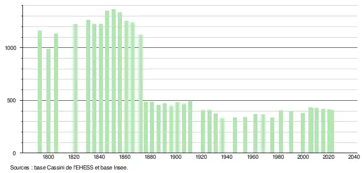 L'évolution du nombre d'habitants est connue à travers les recensements de la population effectués dans la commune depuis 1793. Pour les communes de moins de 10 000 habitants, une enquête de recensement portant sur toute la population est réalisée tous les cinq ans, les populations de référence des années intermédiaires étant quant à elles estimées par interpolation ou extrapolation[17]. Pour la commune, le premier recensement exhaustif entrant dans le cadre du nouveau dispositif a été réalisé en 2005[18].