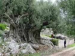 Pline l'Ancien parla d'un olivier sacré en Grèce dont l'âge était de plus de 1 600 ans. Plusieurs oliviers du Jardin de Gethsémani à Jérusalem, dont le nom provient des mots hébreux gat shemanim signifiant « pressoir à huile », sont réputés dater de l'époque de Jésus[17]. La tradition fait remonter certains oliviers italiens à l'époque de l'Empire romain. Cependant, l'âge d'un olivier crétois a pu être estimé à plus de 2 000 ans[18], et un autre sur l'île de Brijuni (Brioni), dans la province d'Istrie en Croatie, donne toujours régulièrement des fruits malgré son âge d'environ 1 600 ans[19]. Un olivier situé à Santu Baltolu di Carana dans l'île italienne de Sardaigne, et nommé avec respect « s'ozzastru » (« l'oléastre » en langue sarde, Olea europaea L. var. sylvestris) par les habitants de la région, est réputé être vieux d'au moins trois millénaires selon différentes études. Au nord-est de la Tunisie, l'âge d'un olivier, prétendument le plus vieux d'Afrique, a été estimé à 2500 ans[20]. Il existe au Sud-Liban un arbre vieux de 2 700 ans dans le village de Chaqra dénommé l'arbre des Perses. À Roquebrune-Cap-Martin (Alpes-Maritimes), un vénérable olivier millénaire âgé de plus de 2 000 ans affiche un impressionnant vingt mètres de tour de tronc avec de multiples rejets. Aux abords du pont du Gard, on trouve trois oliviers millénaires, dont l'un a été planté en l'an 938, en Espagne, puis ramené et transplanté près du pont du Gard en 1988. En 2007, il continuait à donner des fruits. Les deux autres oliviers en sont à peu près contemporains.