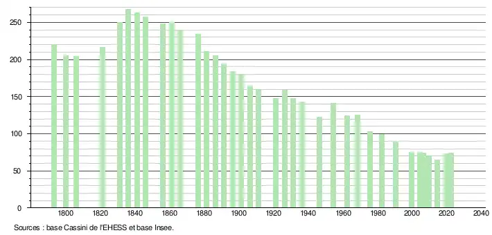 L'évolution du nombre d'habitants est connue à travers les recensements de la population effectués dans la commune depuis 1793. Pour les communes de moins de 10 000 habitants, une enquête de recensement portant sur toute la population est réalisée tous les cinq ans, les populations de référence des années intermédiaires étant quant à elles estimées par interpolation ou extrapolation[21]. Pour la commune, le premier recensement exhaustif entrant dans le cadre du nouveau dispositif a été réalisé en 2004[22].