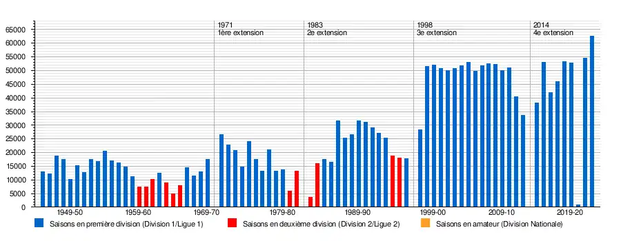 Après un maintien obtenu lors la dernière journée en 1958[33], l'Olympique de Marseille descend pour la première fois de son histoire en deuxième division en 1959. Les Phocéens font péniblement leurs débuts en deuxième division en terminant à la dixième place[B 4]. Les Marseillais réussissent à remonter en Division 1 en 1962 grâce à l'arrivée du technicien brésilien Otto Glória. En effet, durant ses quatre mois passés avec le club phocéen, il ne perd qu'un seul match grâce notamment au buteur Étienne Sansonetti auteur de 16 réalisations en 38 rencontres. Cependant, la saison d'après, les nombreux changements sur le banc olympien ne permettent pas d'empêcher une nouvelle descente du club en Division 2[27]. L'Olympique de Marseille fait par ailleurs ses premiers pas sur la scène européenne en Coupe des villes de foires. Les Olympiens connaissent néanmoins une élimination prématurée dès le premier tour en matchs aller-retour face aux Belges de l'Union Saint-Gilloise (1-0 ; 4-2)[B 5]. Pour la saison 1963-1964, les hommes de Jean Robin ratent de peu la remontée en Division 1 en terminant le championnat à la cinquième place malgré les 20 buts de son buteur Antoine Keller[B 4].