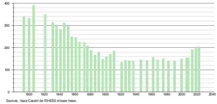 L'évolution du nombre d'habitants est connue à travers les recensements de la population effectués dans la commune depuis 1793. Pour les communes de moins de 10 000 habitants, une enquête de recensement portant sur toute la population est réalisée tous les cinq ans, les populations de référence des années intermédiaires étant quant à elles estimées par interpolation ou extrapolation[21]. Pour la commune, le premier recensement exhaustif entrant dans le cadre du nouveau dispositif a été réalisé en 2008[22].